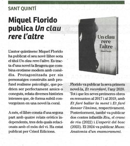 La Fura – 19/3/26 L’autor quintinenc Miquel Florido ha publicat el seu vuité*(correcció) llibre sota el títol Un clau rere l’altre. Es tracta d’una novel·la lleugera que combina erotisme modern amb comèdia. Protagonitzada per