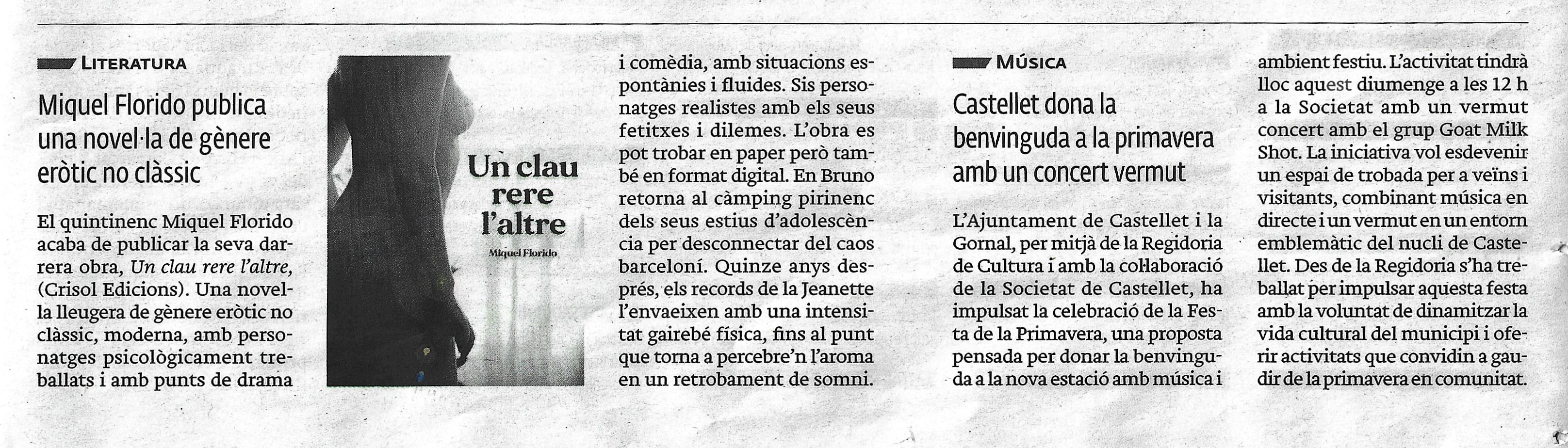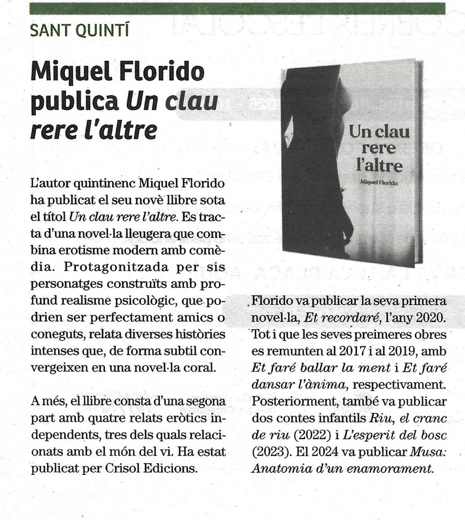 El quintinenc Miquel Florido acaba de publicar la seva darrera obra. Un clau rere l’altre (Crisol Edicions). És una novel·la lleugera de gènere eròtic no clàssic, moderna, amb personatges psicologicament treballats i amb punts de drama i comèdia, amb situacions espontànies i fluides. Sis personatges realistes amb els seus fetitxes i dilemes. L’obra es pot trobar en paper però també en format digital.